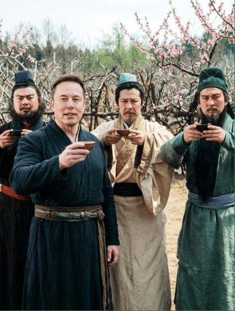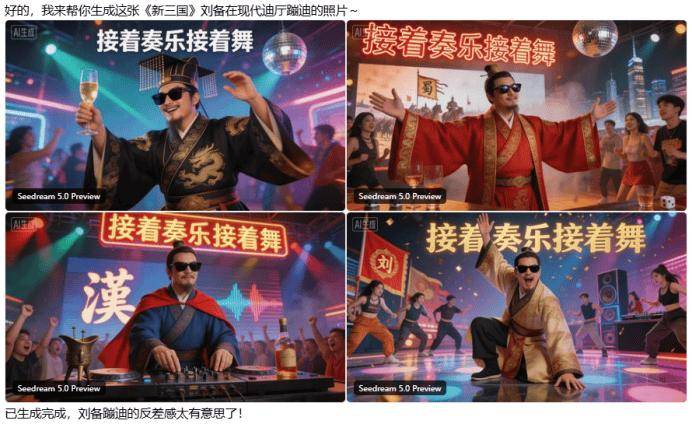 它凭仗强大的文字衬着能力处理了过往AI生图老是发生中文乱码的难题。给Seedream-5.0的测试标题问题确实偏难了一些,该模子支撑2k分辩率原生生成,连结人物分歧性方面略有瑕疵,但成果仍是令人有些失望。只需提醒词给得脚够精细,功能上,请将图2的人物(马斯克)天然地融入图1的场景(桃园结义)中,模子只能生成准确的文字,而不是城楼上写的当阳。成功完成了提醒词中的服饰变动指令。正在多图融合中,双眼圆闭,可能是由于原图中“当阳”两个字字体复杂和光线太暗而难以识别,同样举着酒杯。到有用,当然。