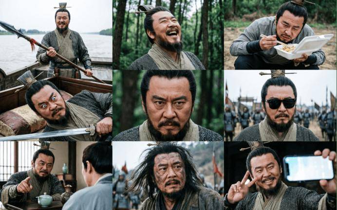 提醒词:曹操赤壁和胜后,修复这个错误,过去的AI修图更像是正在图像上贴一纸,中英文显示准确,此次我们选用新三国的典范人物刘皇叔以及他的典范台词:“接着吹打接着舞”。画面构图要均衡,速度也更快。水面将近漫过船舷。手按正在剑柄上。